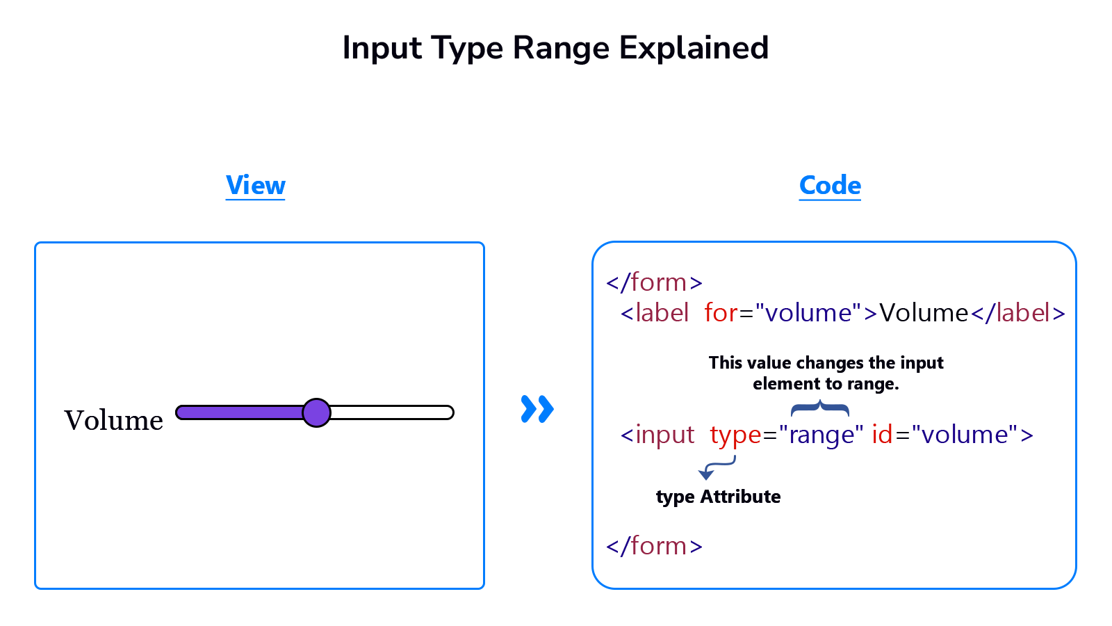 To provide an approximate number between the minimum value and the maximum value, input type="range" is used. The browser provides a simple interface for the convenience of the user. input type="range" is used in various cases, such as volume control, brightness, age range selection, rating, etc.