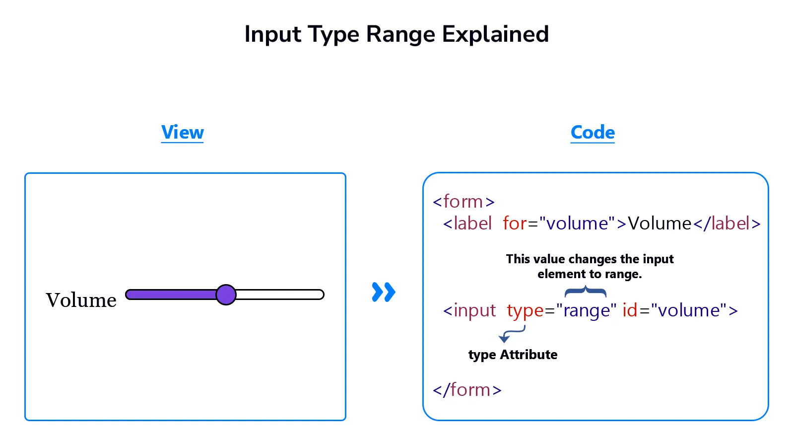 To provide an approximate number between the minimum value and the maximum value, input type="range" is used. The browser provides a simple interface for the convenience of the user. input type="range" is used in various cases, such as volume control, brightness, age range selection, rating, etc.
